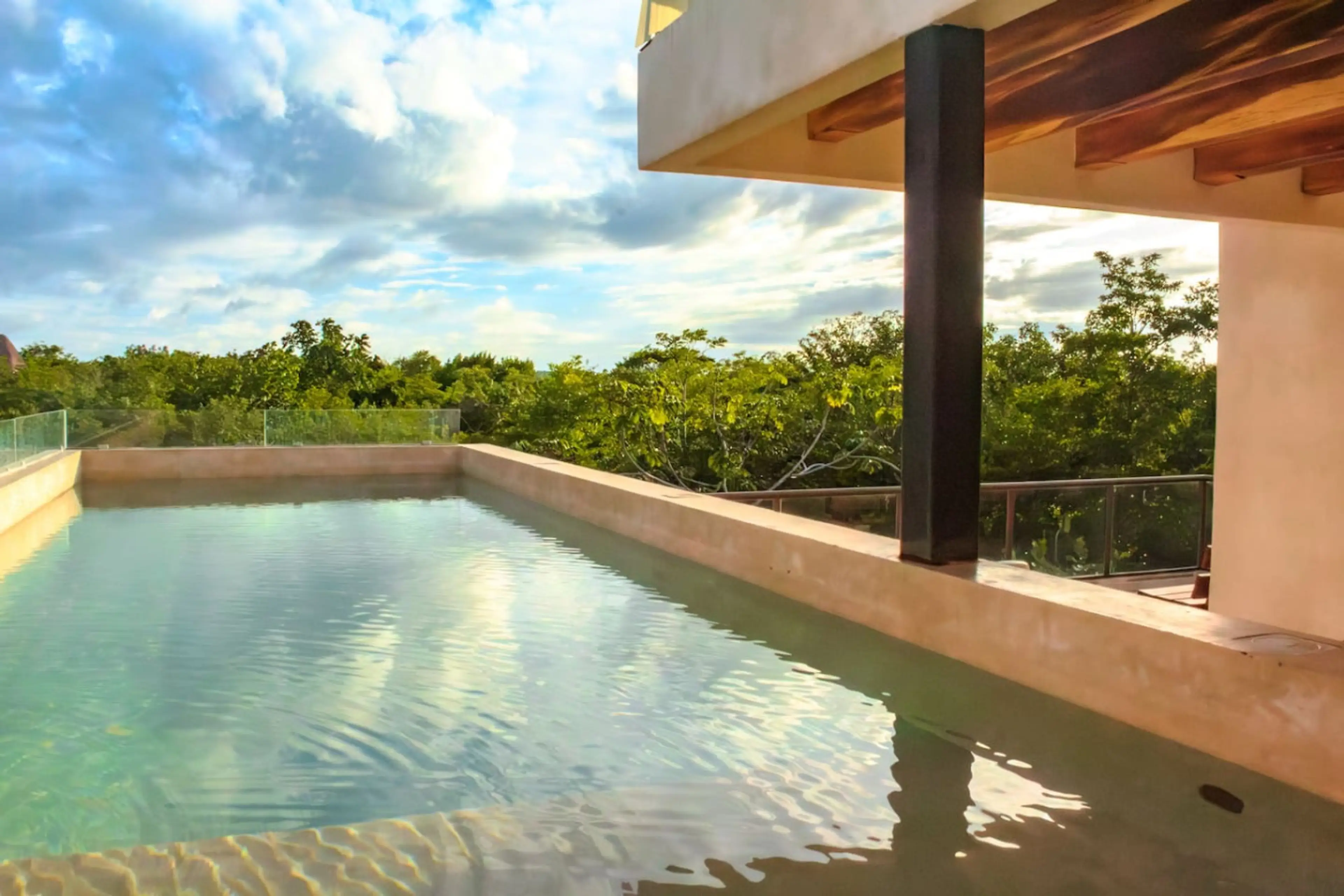 Amplio Studio Suite con balcón y vista al jardín y piscina dentro de Santuario Hotel Boutique. Espacio cómodo rodeado de selva, ideal para estancias relajadas en la Riviera Maya. Incluye cocineta equipada y acceso a piscina rooftop exclusiva, además de las áreas comunes del glamping K’u’ Kuk. Perf...